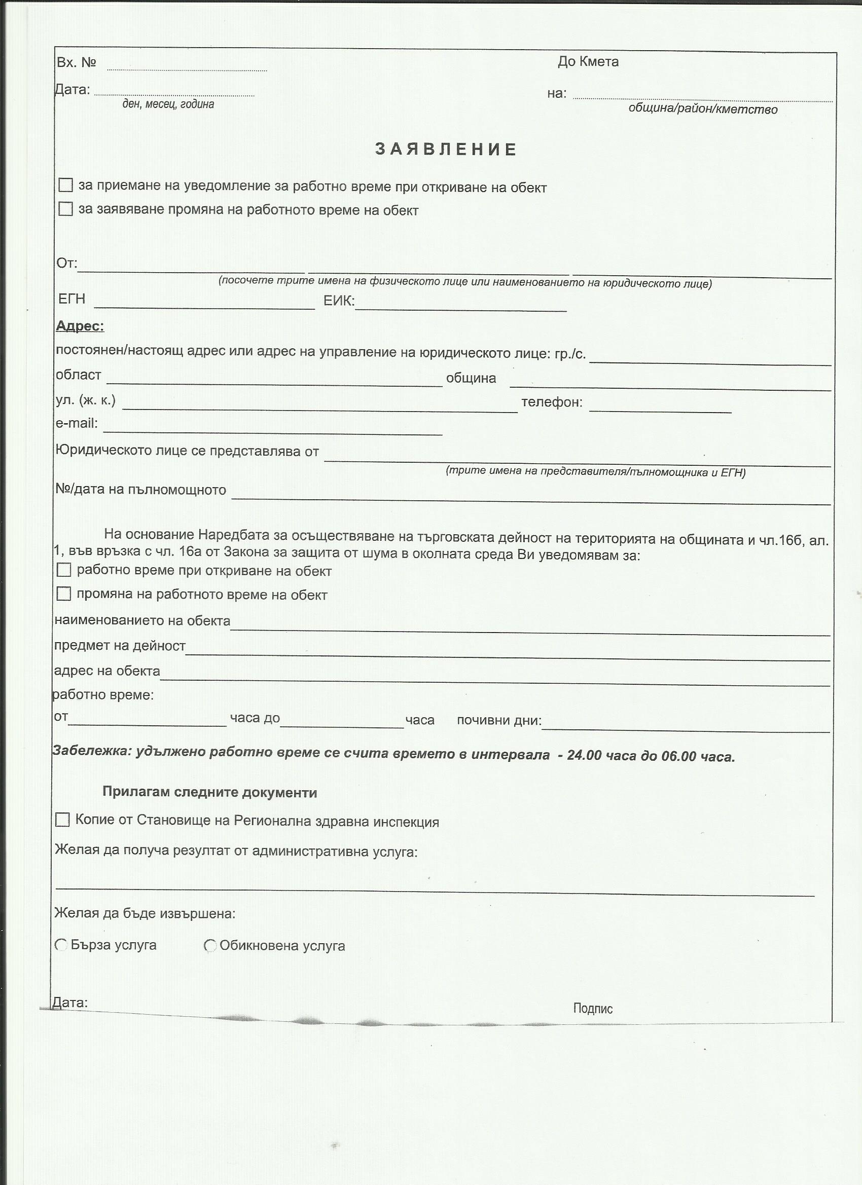 Процедура по предоставяне на услугата:•Прием на заявлението с приложените документи в Центъра за административно обслужване.