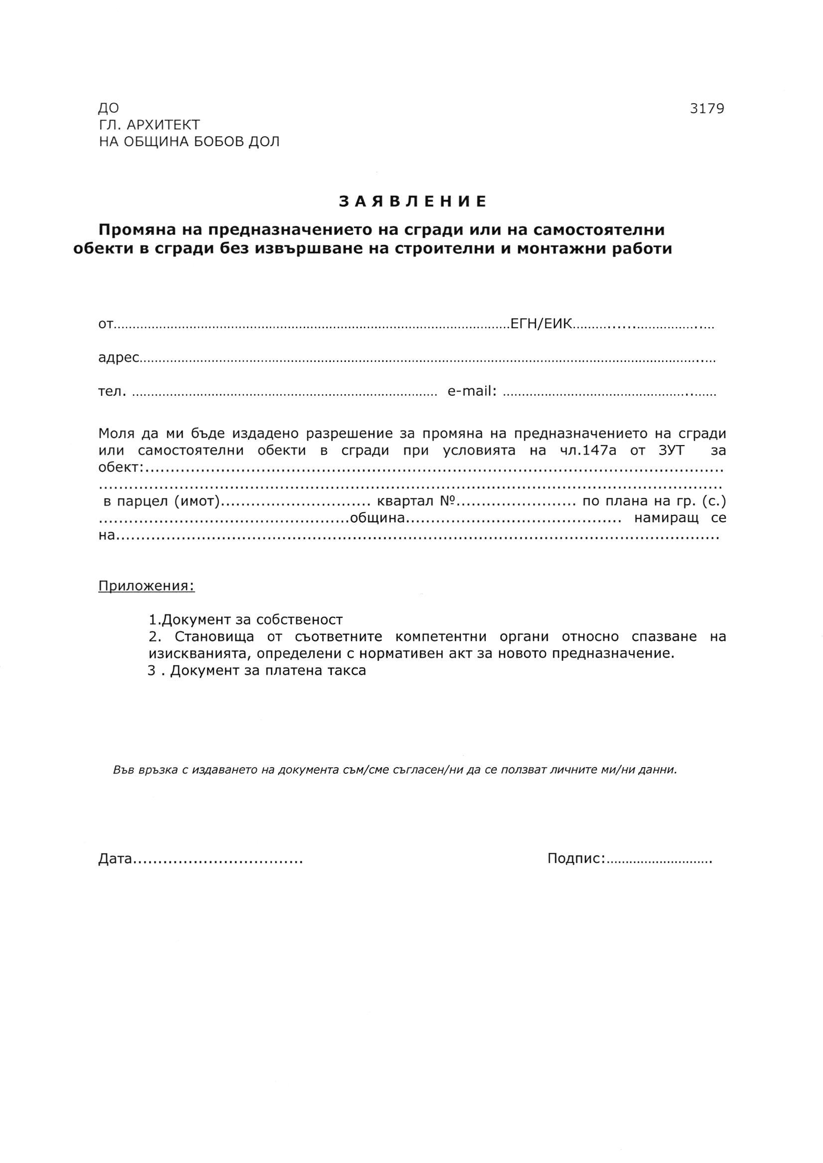 Издаване на разрешение за промяна на предназначението на сгради или на самостоятелни обекти в сгради без извършване на строителни и монтажни работиПри промяна на предназначението на сгради или на самостоятелни обекти в сгради без извършване на строителни и монтажни работи (СМР) се издава разрешение за промяна на предназначението от главния архитект на общината.