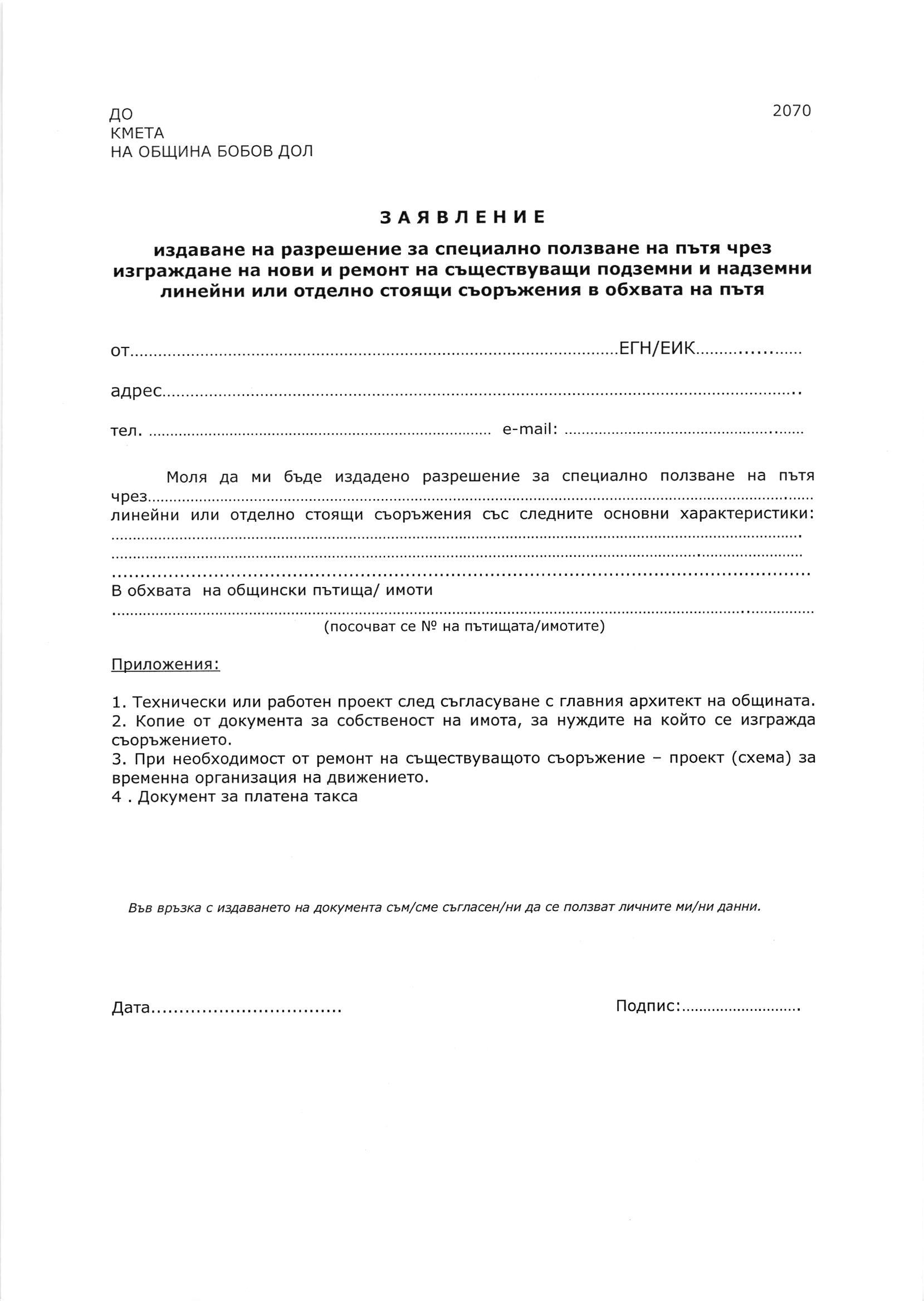 Издаване на разрешение за специално ползване на пътя чрез изграждане на нови и ремонт на съществуващи подземни и надземни линейни или отделно стоящи съоръжения в обхвата на пътяИздаване на разрешение за специално ползване на пътя чрез изграждане на нови и ремонт на съществуващи подземни и надземни линейни или отделно стоящи съоръжения в обхвата на пътя.