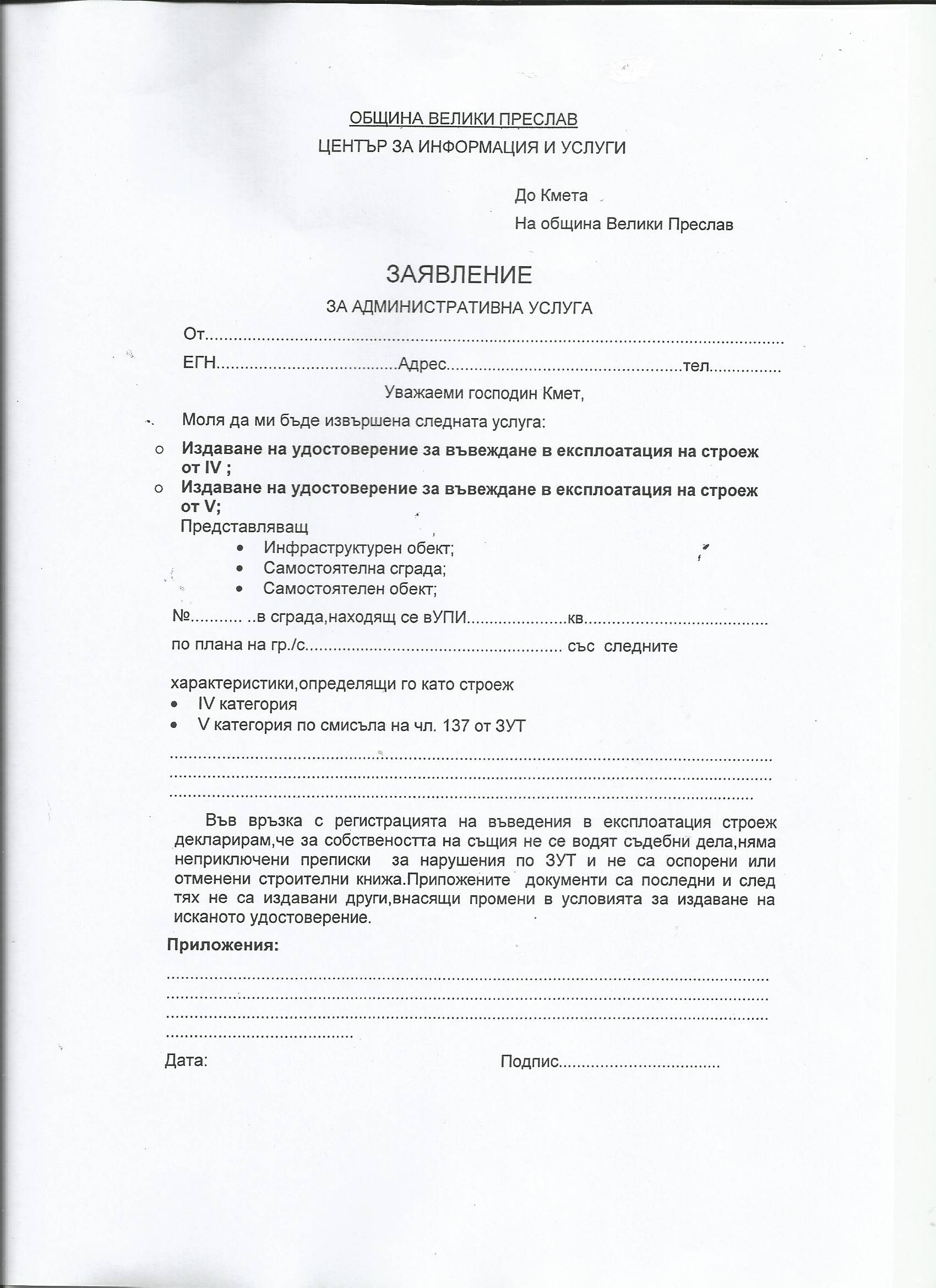 За услугата се заплаща таксаЗа строежи от четвърта категория (при наличие на окончателния доклад по чл. 168, ал. 6 от ЗУТ от лицето, осъществило надзор в строителството) а/ частни пътища, улици от второстепенната улична мрежа V и VI клас и съоръженията към тях - 150 лв./км., но не повече от 1000 лв. б/ жилищни и смесени сгради със средно застрояване - 300 лв. в/ сгради и съоръжения за обществено обслужване с разгърната застроена площ от 1000 до 5000 кв.м. или с капацитет от 100 до 200 места за посетител - 500 лв. г/ производствени сгради с капацитет от 50 до 100 работни места и съоръженията към тях - 500 лв. д/ паркове, градини и озеленени площи до 1 хектар - 50 лв. е/ реконструкции, преустройства, основни ремонт и смяна предназначението на строежите от ази категория - съответно цените по точки а, б, в, г и Д ж/ вътрешни преустройства на сградите от първа до четвърта категория, с които не се засяга конструкцията им - 300 лв. За строежи от пета категория (въз основа на служебна проверка на обстоятелствата по чл. 168, ал. 1 от ЗУТ по документацията и съответствието на строежа с нормативните изисквания) а/ жилищни и смесени сгради с ниско застрояване, вилни сгради - 100 лв. б/ сгради и съоръжения за обществено обслужване с разгърната застроена площ до 1000 кв.м. или с капацитет до 100 места за посетители - 200 лв. в/ производствени сгради с капацитет до 50 работни места и съоръженията към тях - 250 лв. г/ строежи от допълващо застрояване, извън тези по шеста категория - 50 лв.