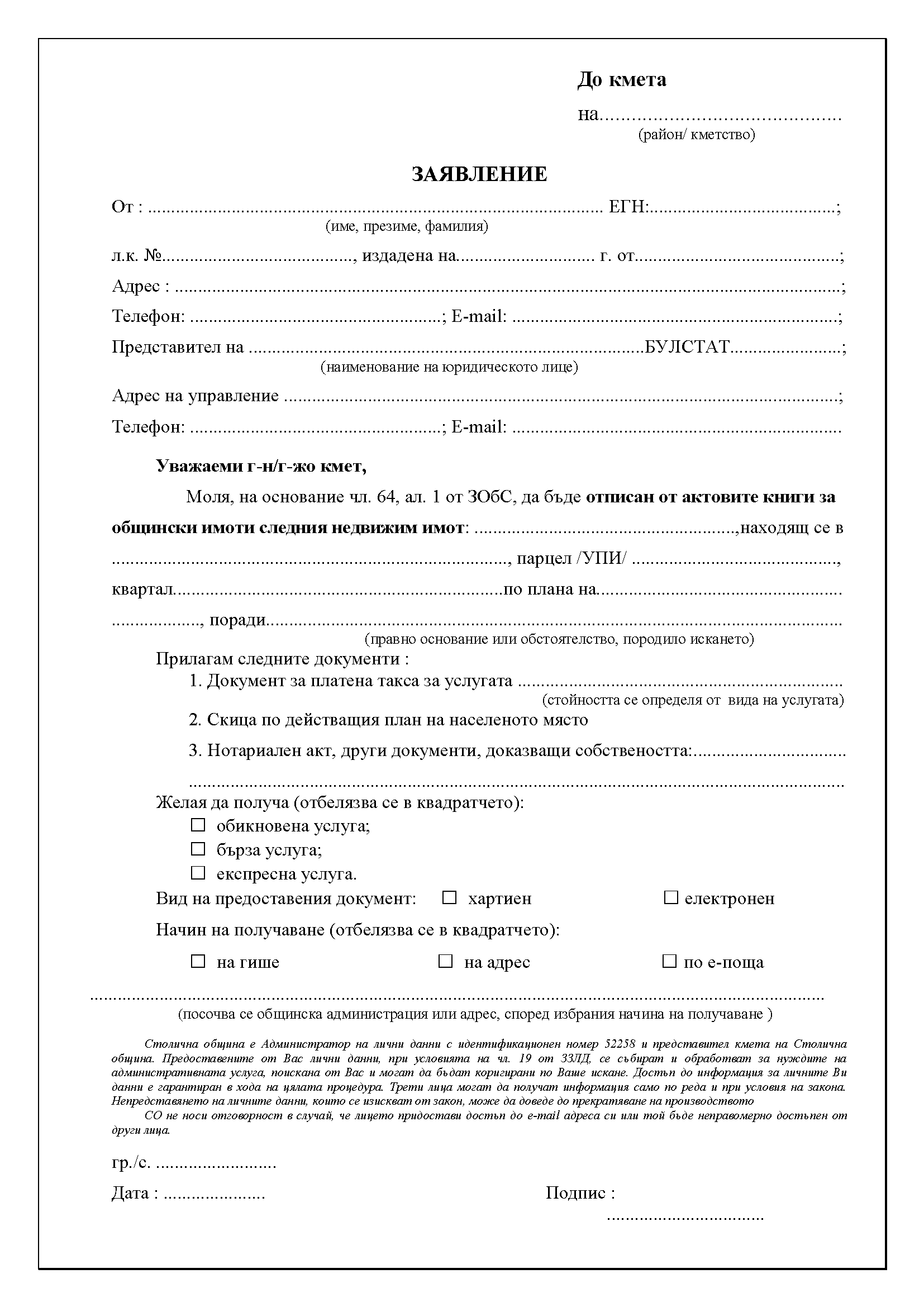 Процедура по предоставяне на услугата:Заявителят подава заявление в Центъра за информация и услуги или през Единния портал за достъп до електронни администаривни услуги, заедно с копие на документ за собственост (нотариален акт, договор, решение на поземлена комисия, съдебно решение или друго), доказващ наличието на интерес и скица на имота. В случай че имотът е земеделски се изисква и скица и удостоверение по чл. 13 от ППЗСПЗЗ. Заплаща таксата, определена с НОАМТЦУПСО.