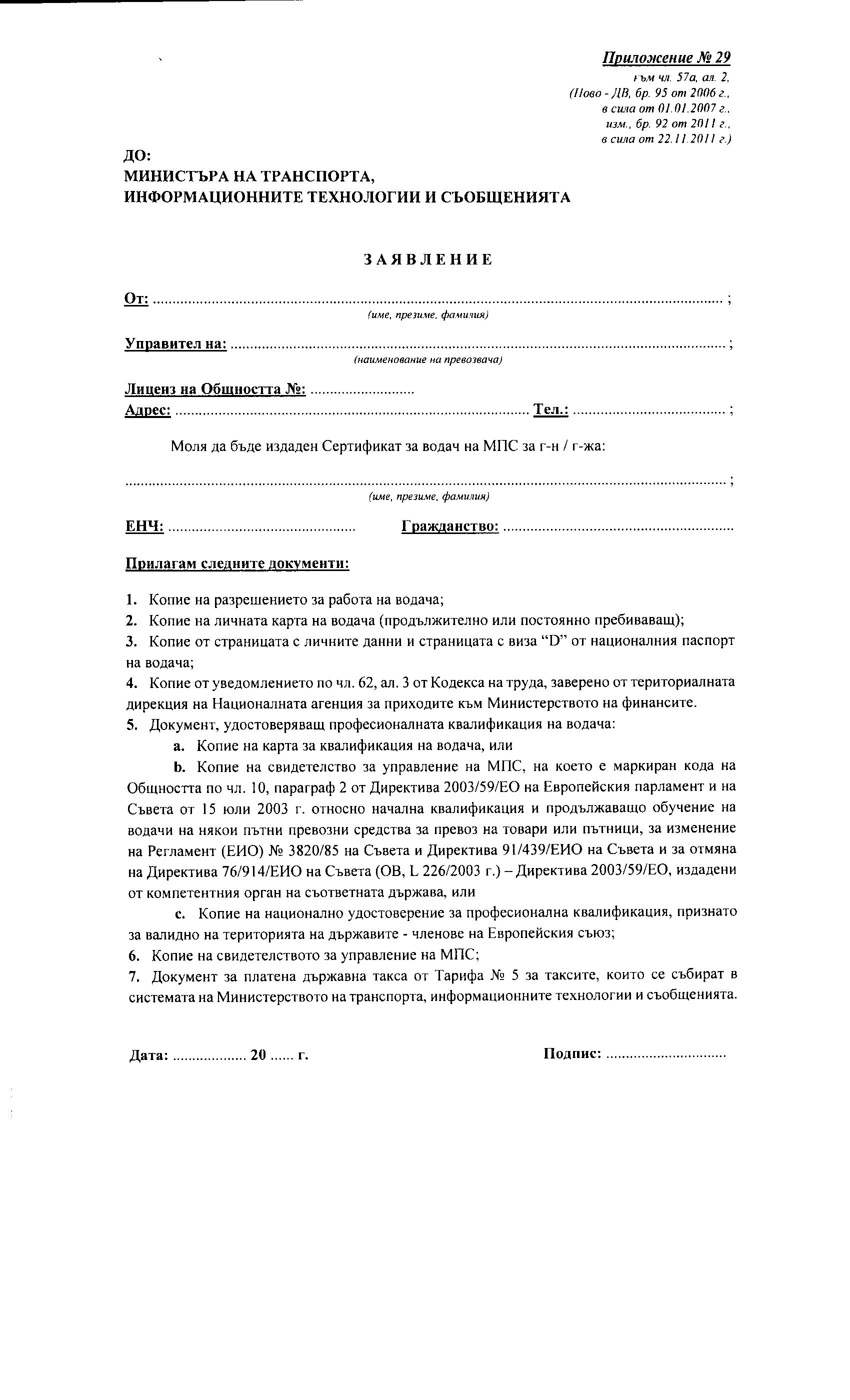 - Заявление за издаване на сертификат за водач на МПС за обществен превоз на товари, който е гражданин на държава, която не е член на ЕС (приложение № 29);