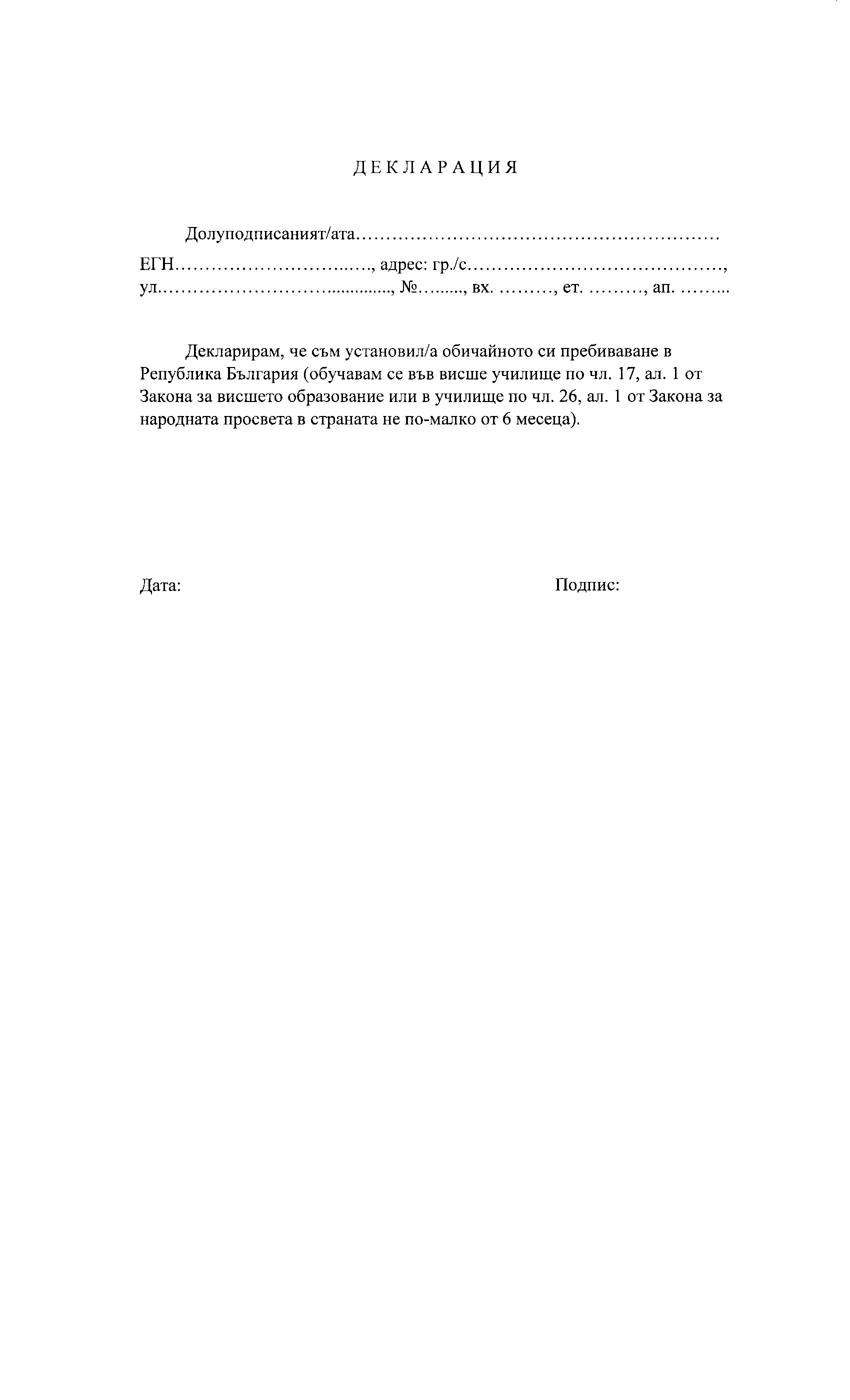 Декларация по чл. 17, ал. 1 от Закона за висшето образование или в училище по Закона – за лица, чието обичайно пребиваване е в Република България, както е дефинирано в Регламент (ЕО) № 1071/2009 на Европейския парламент и на Съвета от 21 октомври 2009 година;