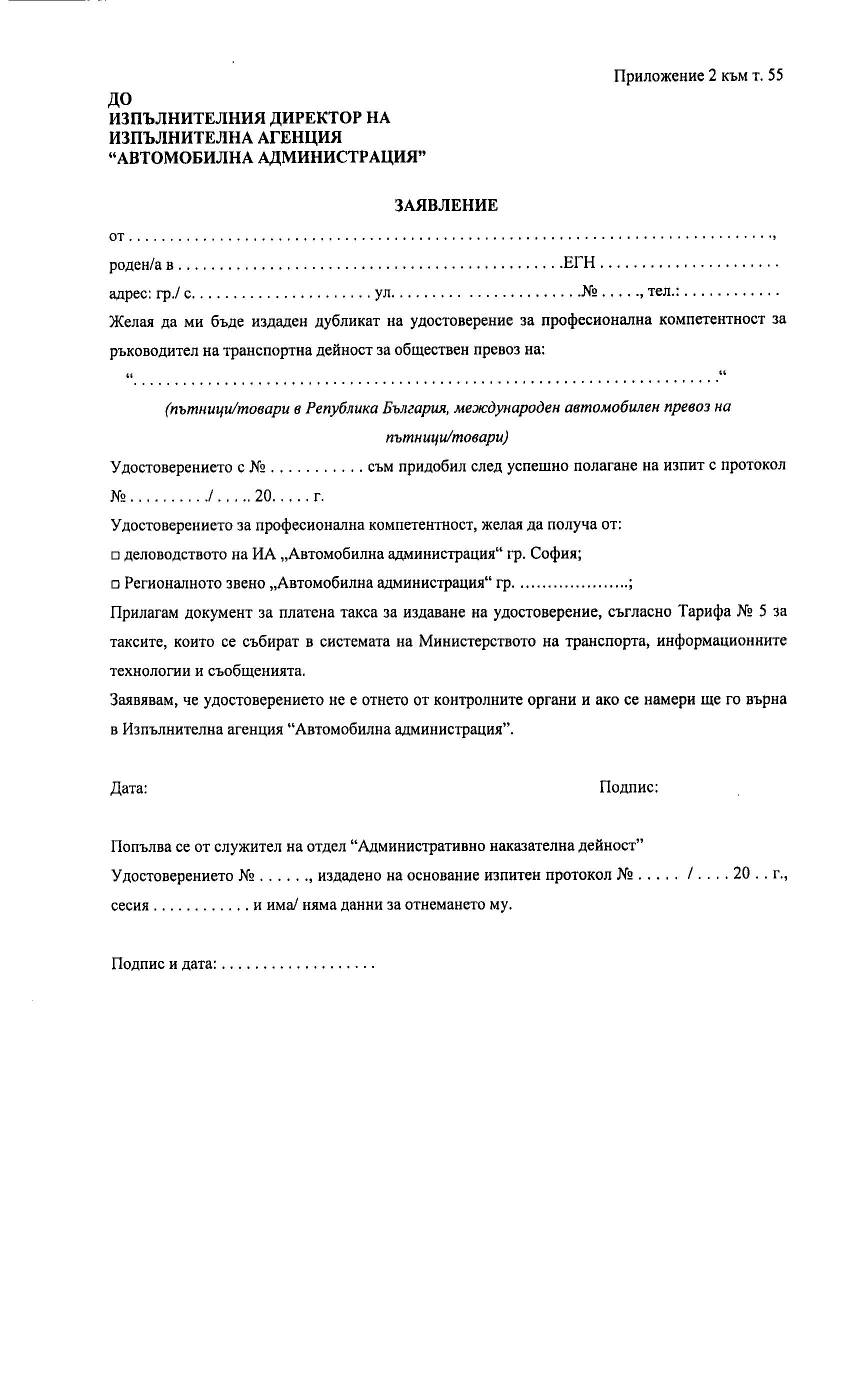 - Заявление за явяване на изпит за придобиване на удостоверение за професионална компетентност за ръководители на транспортна дейност;