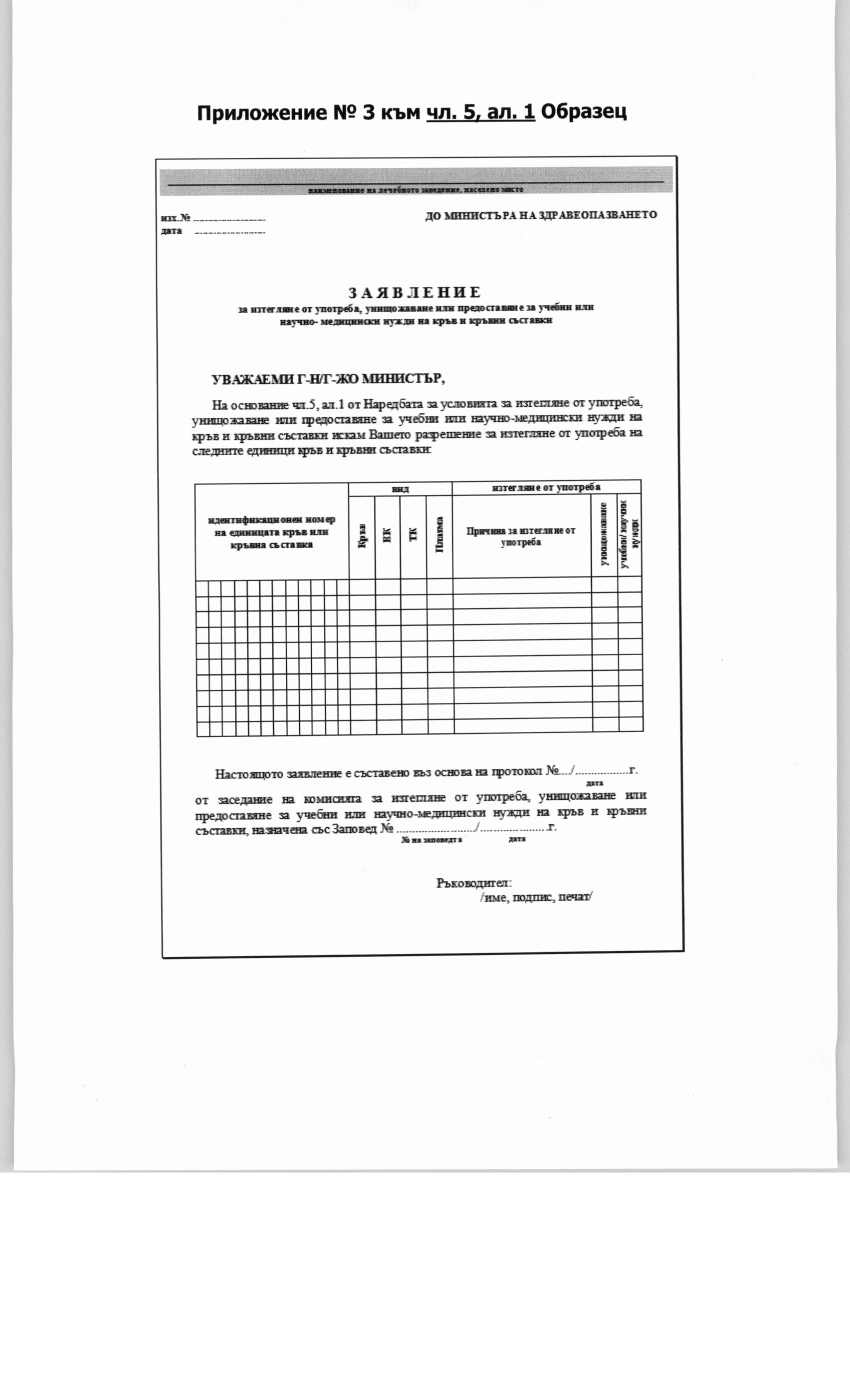 Какво е необходимо, за да ползвате услугата:За получаване на разрешение за изтегляне от употреба, унищожаване или предоставяне за учебни или научно-медицински нужди на поставените под карантина единици кръв или кръвни съставки ръководителите на лечебните заведения подават заявление по образец до министъра на здравеопазването, съгласно приложение № 3 към чл. 5, ал. 1 от Наредба № 8/2007 г. за изтегляне от употреба, унищожаване или предоставяне за учебни или научно-медицински нужди на кръв и кръвни съставки.