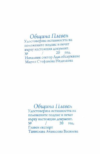 Заверката се извършва от оторизирани лица, определени със заповед на кмета на Община Плевен, незабавно след заплащането на таксата от 10 лв. Към настоящия момент оторизирани лица за извършване на заверката на документи, подлежащи на легализация, са Мария Недялкова - началник сектор Обслужване и Танислава Василева - главен експерт в сектор Обслужване.